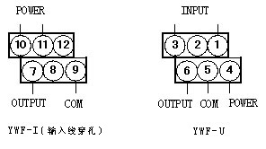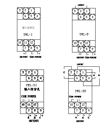 注: 1、YWF、YWL系列交流電流變送器輸入線從變送器外殼設(shè)置的穿孔穿過,不分極性。